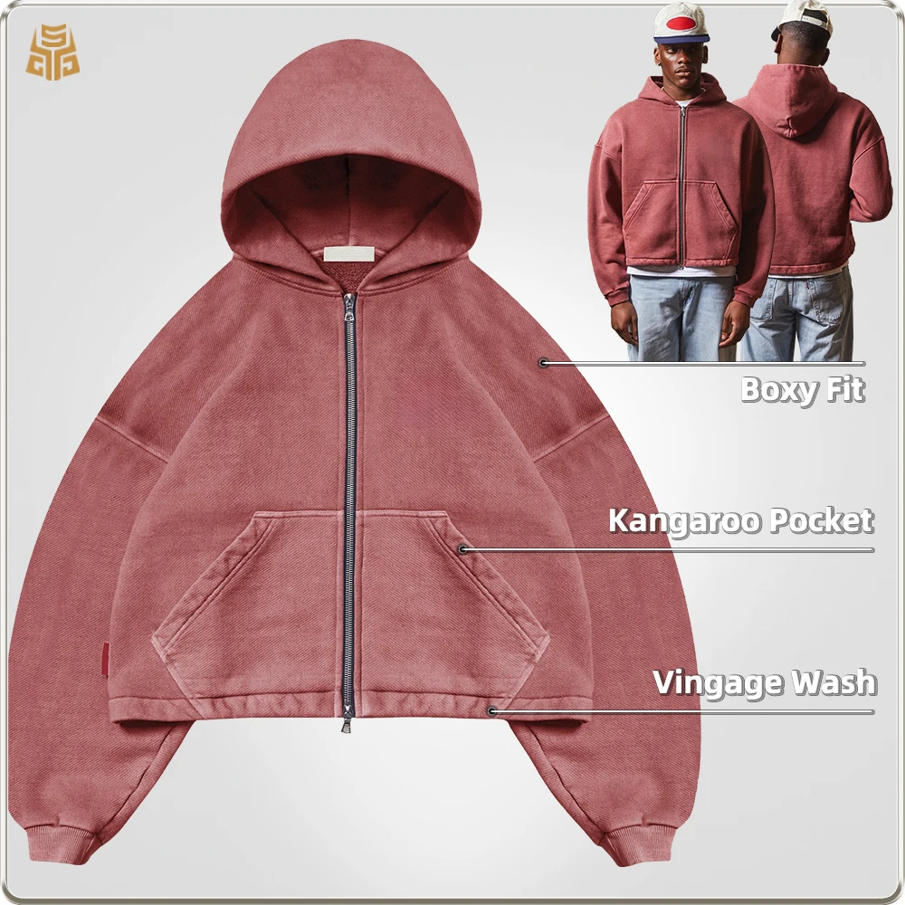 sweat-shirts surdimensionnés en coton 400 g/m² avec logo personnalisé, à fermeture éclair, style vintage lavé, coupe courte, pour hommes