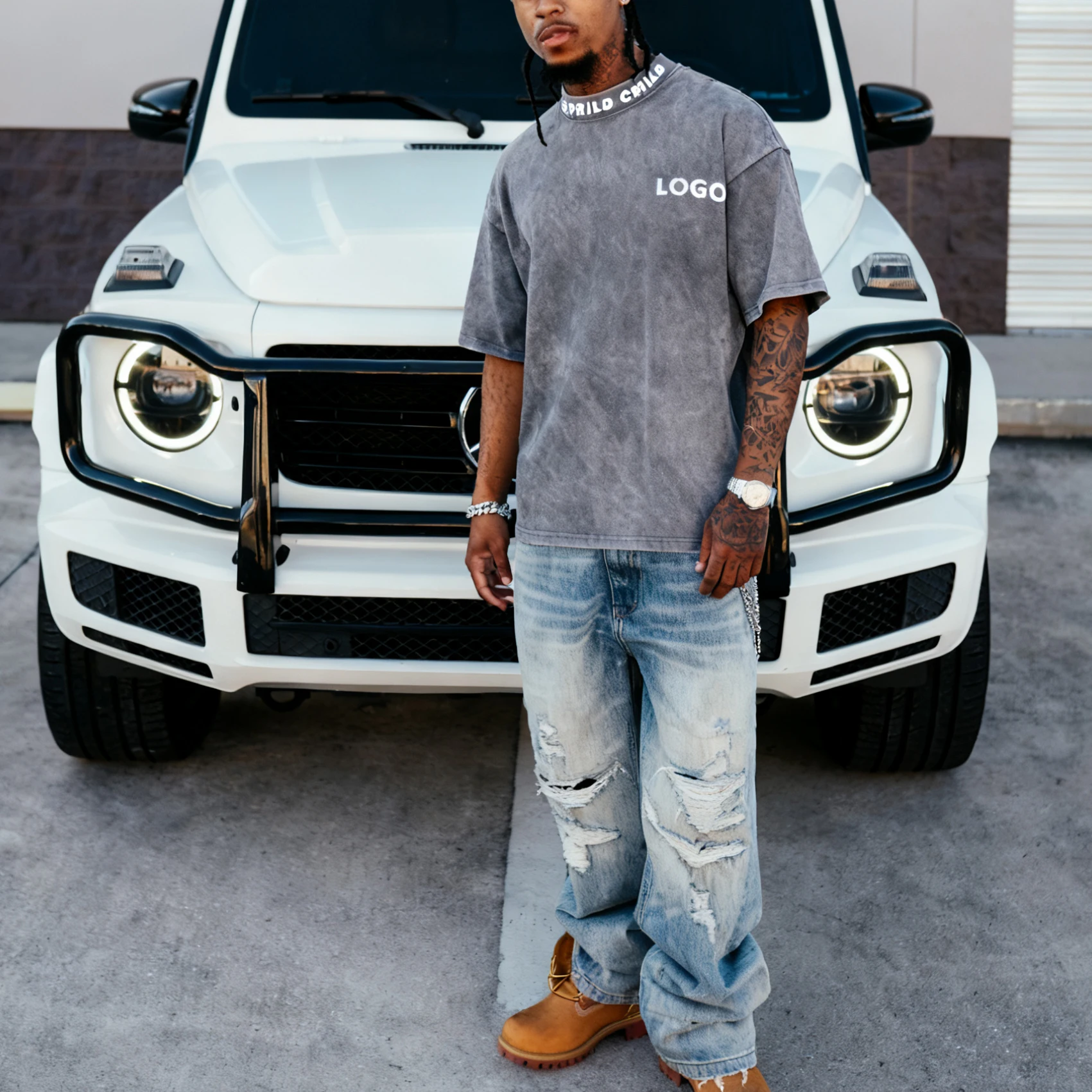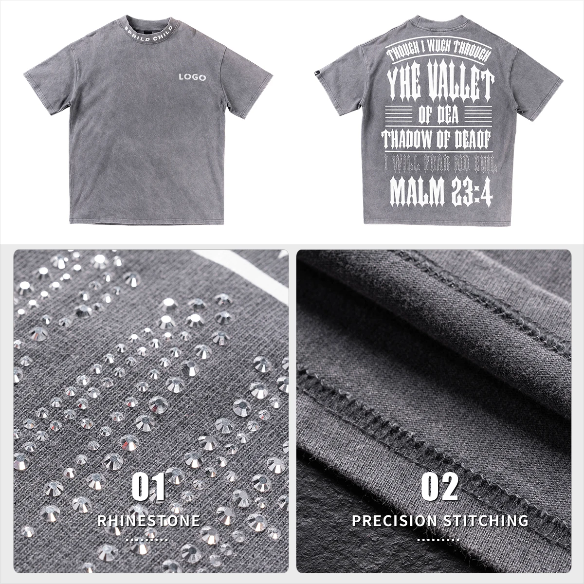 T-shirt personnalisé vintage pour homme à lavage acide 100 % coton, design avec strass et impression sérigraphique, T-shirt streetwear surdimensionné pour homme