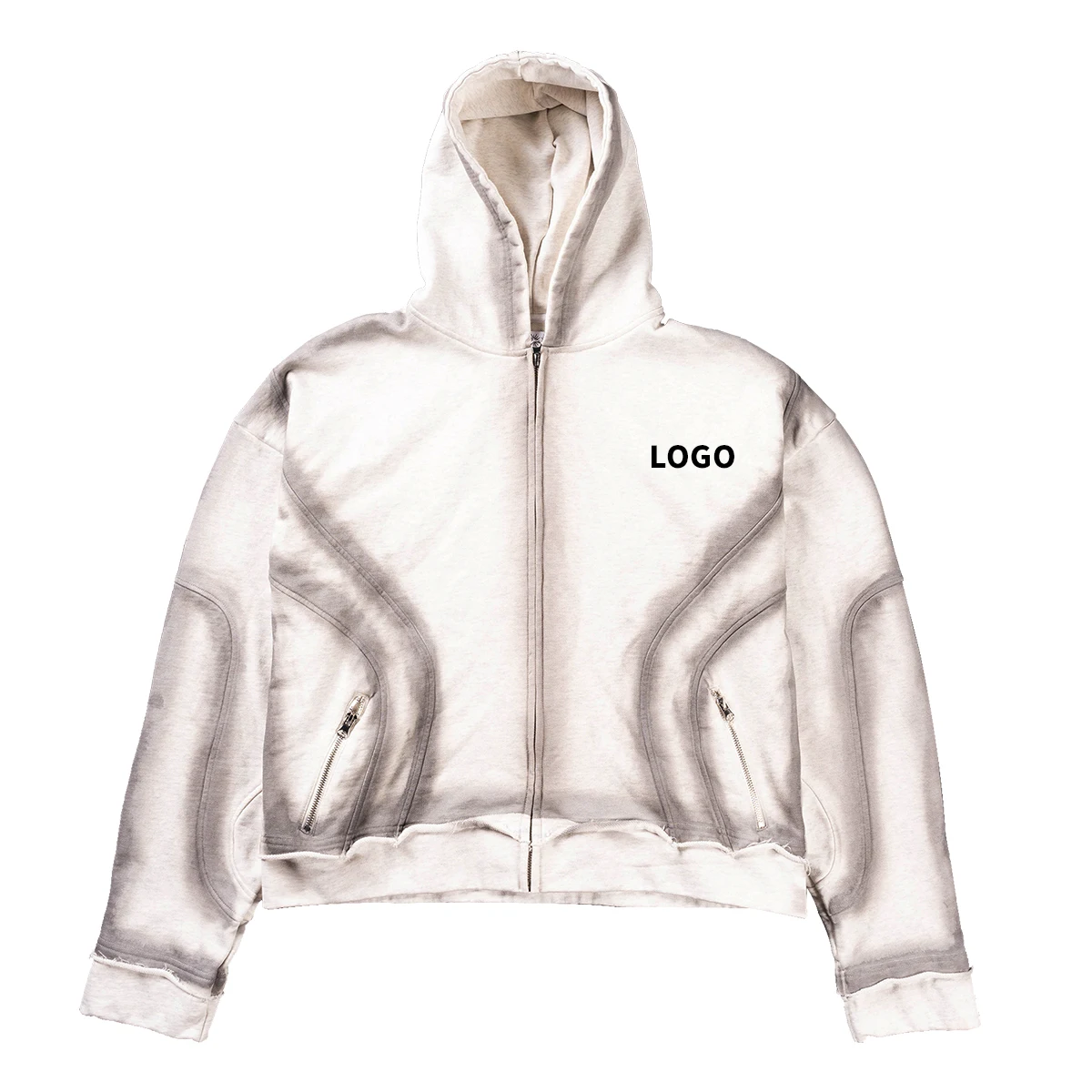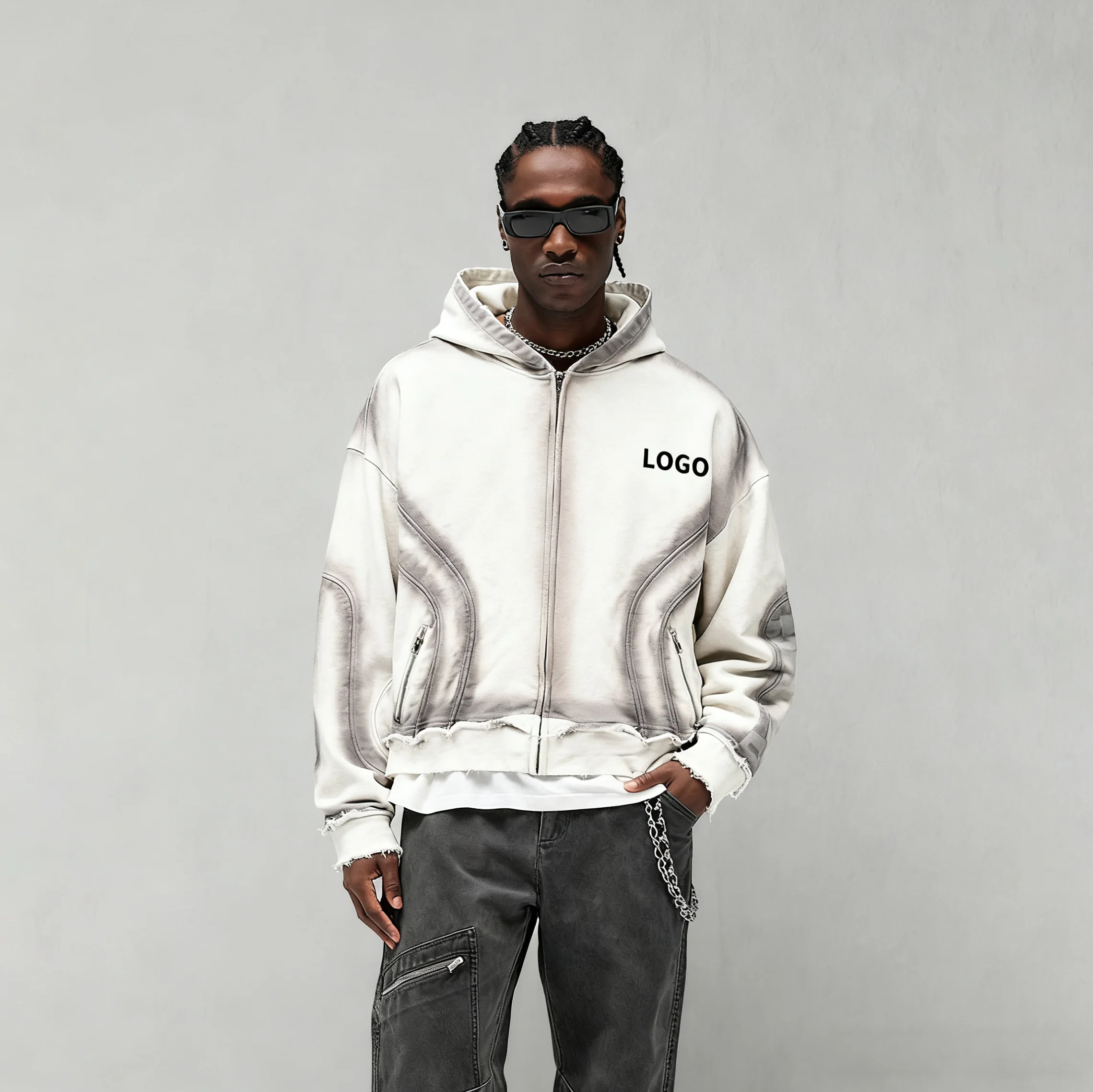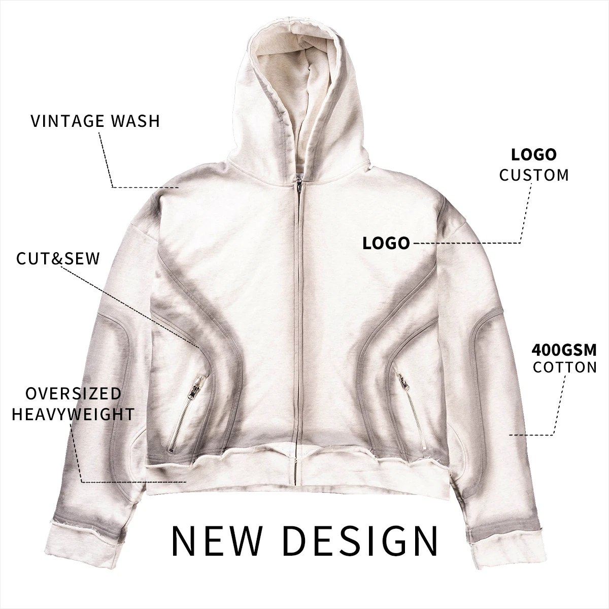 400gsm 박스형 핏 스트리트웨어 더티워시 지퍼업 후드 티셔츠 빈티지 디스트레스드 후드 티셔츠 남성용 오버사이즈 헤비웨이트 컷앤소 디자인