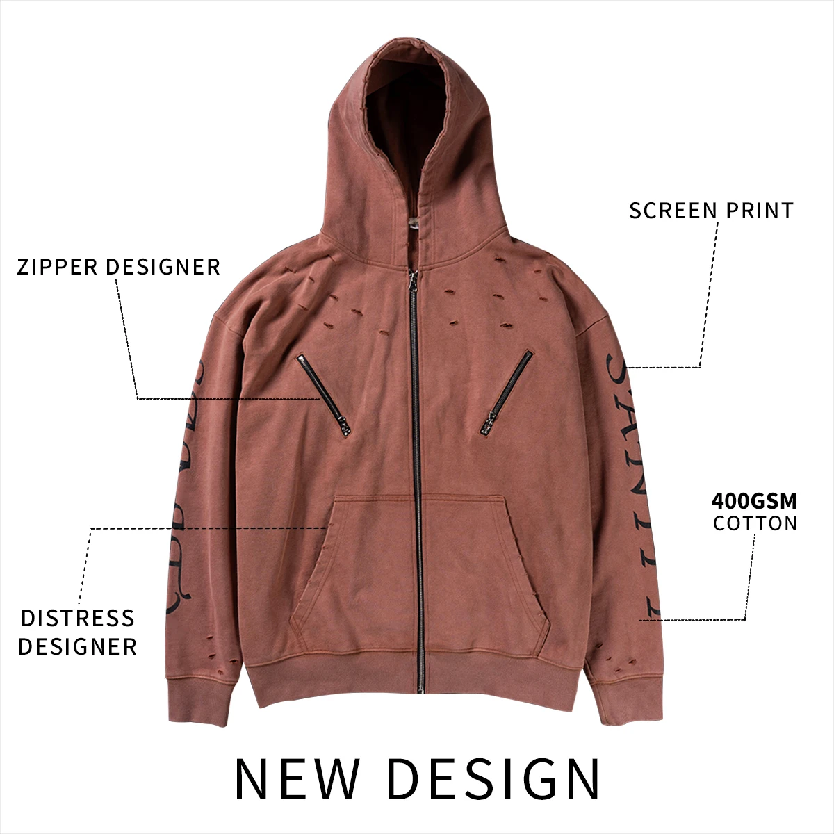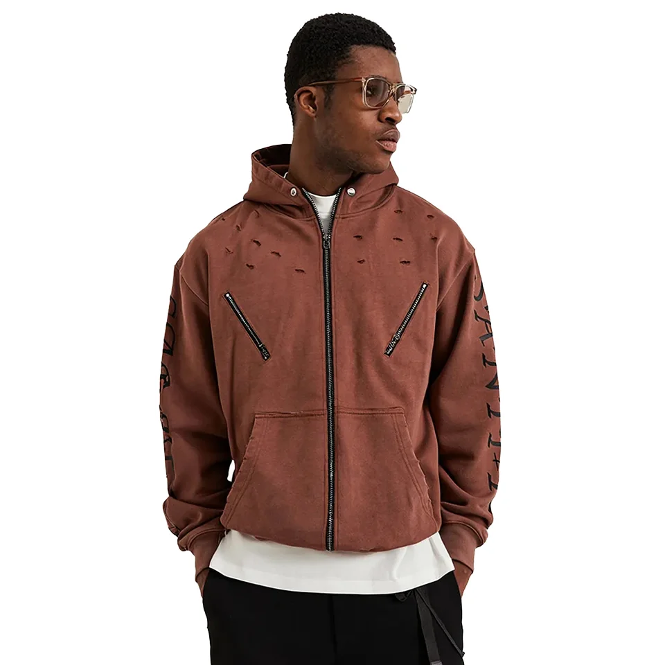 400gsm Vintage Acid Wash Mens Zipper-Up Hoodie Oversized Heavyweight Hoodie Manufacturers Screen Printing and Distress Design