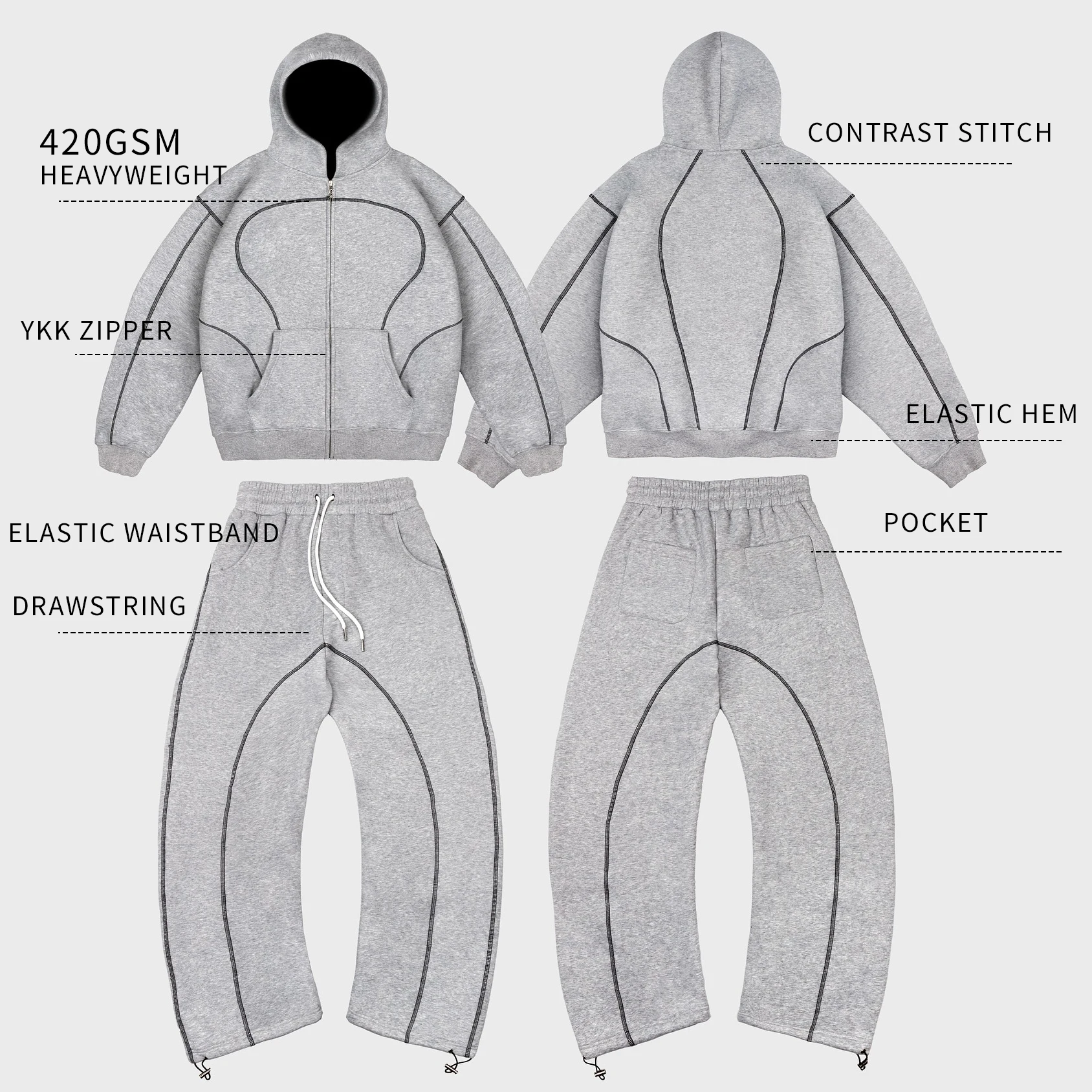 Custom Sweatpants and Hoodie Set Design Oversized Printing Zip up Hoodie 500gsm Streetwear Heavyweight 100% Cotton for Man